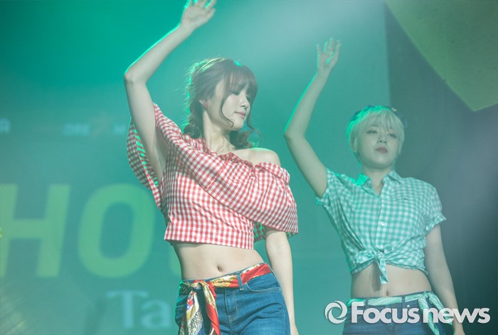 (서울=포커스뉴스) 23일 오전 서울 마포구 하나투어 브이홀에서 열린 걸그룹 타히티의 '알쏭달쏭' 쇼케이스에 참여한 멤버 지수(왼쪽)와 아리가 무대를 선봉이고 있다.