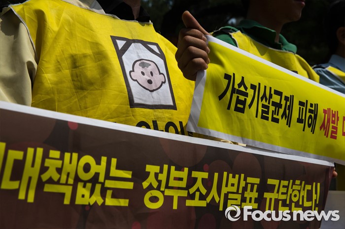 (서울=포커스뉴스) 23일 오전 서울 서초구 서울중앙지검 앞에서 가습기 살균제 피해자와 가족모임 관계자들이 기자회견을 열고 유해독성물질을 승인‧방치한 국가를 상대로 법정소송에 돌입할 것을 밝히고 있다. 피고발인은 강현욱·김명자 전 환경부 장관과 가습기 살균제 성분들이 승인될 당시 환경부 환경보건관리과 국장·과장 등 실무진 6명 이다.