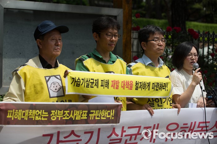 (서울=포커스뉴스) 23일 오전 서울 서초구 서울중앙지검 앞에서 가습기 살균제 피해자와 가족모임 관계자들이 기자회견을 열고 유해독성물질을 승인‧방치한 국가를 상대로 법정소송에 돌입할 것을 밝히고 있다. 피고발인은 강현욱·김명자 전 환경부 장관과 가습기 살균제 성분들이 승인될 당시 환경부 환경보건관리과 국장·과장 등 실무진 6명 이다.