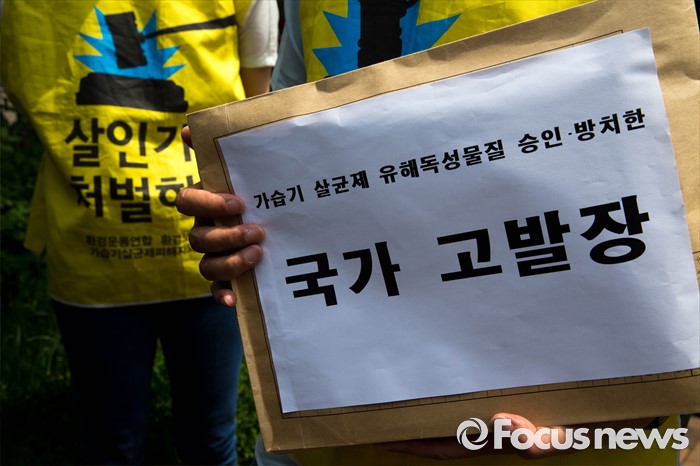 (서울=포커스뉴스) 23일 오전 서울 서초구 서울중앙지검 앞에서 가습기 살균제 피해자와 가족모임 관계자들이 기자회견을 열고 유해독성물질을 승인‧방치한 국가를 상대로 법정소송에 돌입할 것을 밝히고 있다. 피고발인은 강현욱·김명자 전 환경부 장관과 가습기 살균제 성분들이 승인될 당시 환경부 환경보건관리과 국장·과장 등 실무진 6명 이다.
