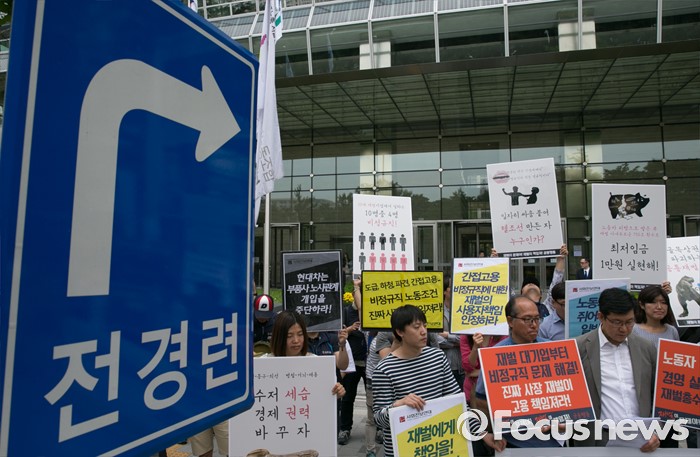 (서울=포커스뉴스) 23일 오전 서울 여의도 전국경제인연합회 앞에서 민주노총과 시민사회단체 등으로 구성된 재벌책임공동행동이 전경련 규탄 및 서울대행진 출발 기자회견을 하고 있다.