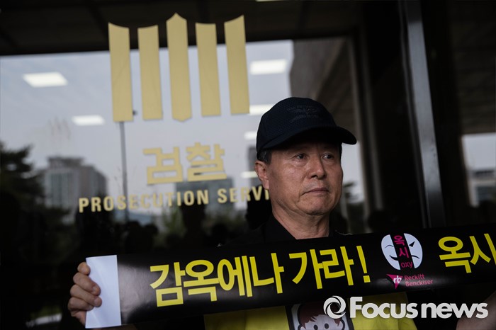 (서울=포커스뉴스) 23일 오전 서울 서초구 서울 중앙지검 앞에서 살균제 피해자와 가족모임 관계자들이 존 리 옥시 레킷벤키저 전 대표 검찰 소환조사를 기다리며 손 피켓을 들고 있다.