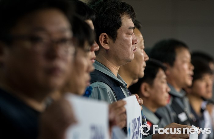 삼성중공업 노조 관계자는 "산업은행이 사측에 추가 자구안을 요청한 것으로 알고 있다"면서 "현재는 최대한 관심을 집중해 상황을 관망 중"이라고 밝혔다. 하지만 이어 "사측이 무리한 요구를 해온다면 그대로 받아들일 수는 없지 않느냐"며 "내부적인 투쟁과 함께 조선노연을 통한 공동투쟁도 함께 진행해나갈 것"이라고 밝혔다.(서울=포커스뉴스) 지난 19일 오전 여의도 국회 정론관에서 열린 '조선산업 발전과 구조조정에 관한 조선업종노조연대 대표자' 기자회견에 참석한 대표자들이 굳은 표정을 짓고 있다. 2016.05.19 양지웅 기자