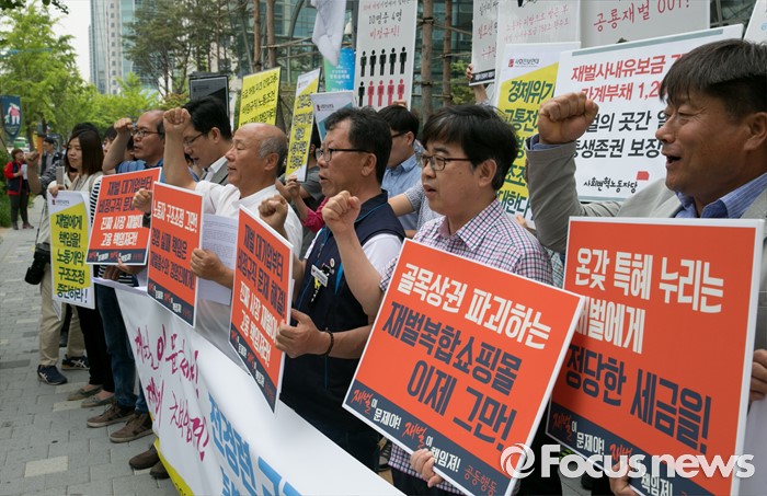 (서울=포커스뉴스) 23일 오전 서울 여의도 전국경제인연합회 앞에서 관계자들이 민주노총과 시민사회단체 등으로 구성된 재벌책임공동행동이 전경련 규탄 및 서울대행진 출발 기자회견을 하고 있다.