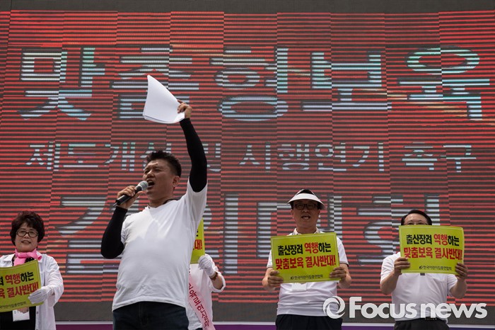 (서울=포커스뉴스) 23일 오후 서울 중구 시청광장에서 보육관계자들이 '어린이집 0~2세 맞춤형 보육제도 개선 및 시행 연기'를 촉구하며 결의대회를 하고 있다.