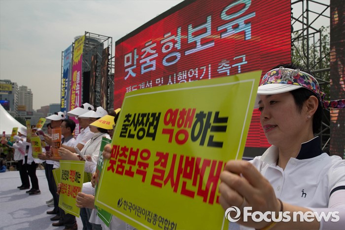 (서울=포커스뉴스) 23일 오후 서울 중구 시청광장에서 보육관계자들이 '어린이집 0~2세 맞춤형 보육제도 개선 및 시행 연기'를 촉구하며 결의대회를 하고 있다.
