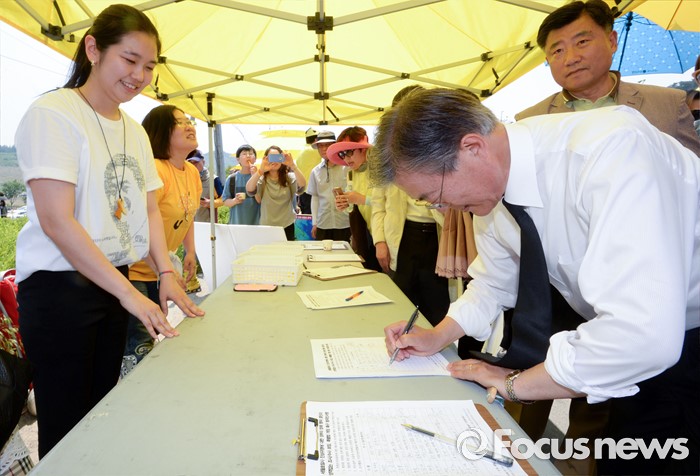 (김해=포커스뉴스) 23일 오후 경남 김해 봉하마을에서 엄수된 故 노무현 전 대통령 서거 7주기 추도식에 참석한 문재인 더불어민주당 전 대표가 세월호 특별법 개정 촉구 범국민 서명에 사인하고 있다.