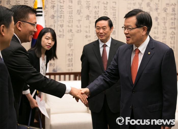 (서울=포커스뉴스) 싱크탱크 '새 한국의 비전'을 준비 중인 정의화(오른쪽) 국회의장이 23일 오후 서울 여의도 국회에서 류치바오(가운데) 중국 공산당 중앙선전부장 일행을 접견, 인사를 하고 있다. 정 의장은 지난 19일 본회의를 마친 뒤 유승민 무소속 의원과 독대한 것으로 알려져 관심을 모으고 있다.