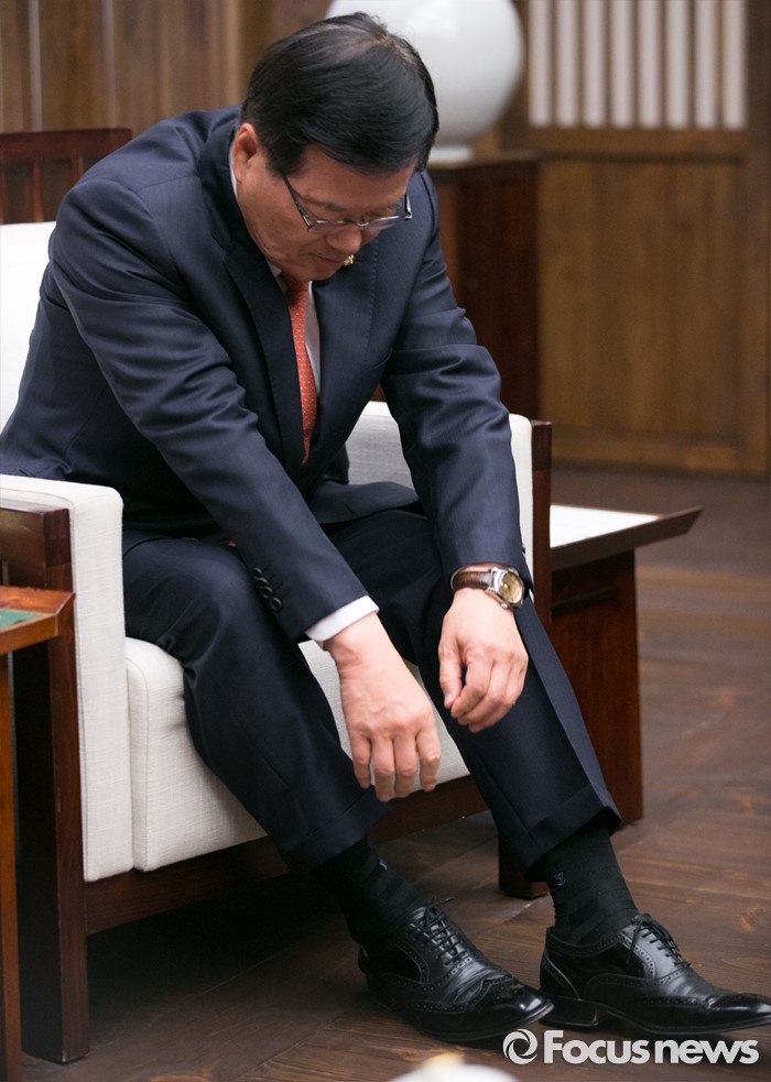 (서울=포커스뉴스) 싱크탱크 '새 한국의 비전'을 준비 중인 정의화 국회의장이 23일 오후 서울 여의도 국회에서 류치바오 중국 공산당 중앙선전부장을 접견, 면담 중 구두끈을 묶고 있다. 정 의장은 지난 19일 본회의를 마친 뒤 유승민 무소속 의원과 독대한 것으로 알려져 관심을 모으고 있다.