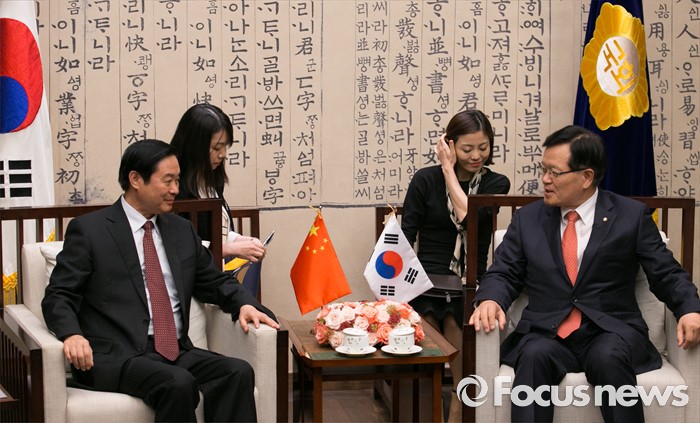 (서울=포커스뉴스) 싱크탱크 '새 한국의 비전'을 준비 중인 정의화(오른쪽) 국회의장이 23일 오후 서울 여의도 국회에서 류치바오 중국 공산당 중앙선전부장을 접견, 면담을 하고 있다. 정 의장은 지난 19일 본회의를 마친 뒤 유승민 무소속 의원과 독대한 것으로 알려져 관심을 모으고 있다.