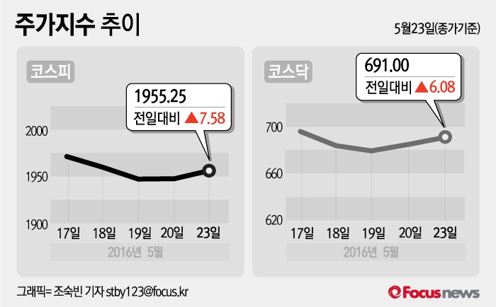 (서울=포커스뉴스) 23일 코스피지수는 전날 보다 0.39%(7.58포인트) 오른 1955.25에 장을 마쳤다. 코스닥지수는 전일 대비 0.89%(6.08포인트) 오른 691.00에 마감했다.