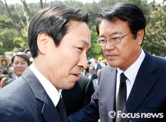 (김해=포커스뉴스) 23일 오후 경남 김해 봉하마을에서 엄수된 故 노무현 전 대통령 서거 7주기 추도식에 참석한 정진석(오른쪽) 새누리당 원내대표와 우상호 더불어민주당 원내대표가 인사하고 있다.