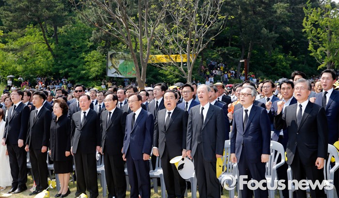 (김해=포커스뉴스) 23일 오후 경남 김해 봉하마을에서 엄수된 故 노무현 전 대통령 서거 7주기 추도식에 참석한 내빈들이 애국가를 제창하고 있다. 앞줄 왼쪽부터 김홍걸 더불어민주당 국민통합위원장, 노 전 대통령 장남 건호 씨, 부인 권양숙 여사, 김원기, 임채정 전 국회의장, 이해찬 노무현재단 이사장, 문희상 더불어민주당 의원, 고영구 전 국정원장, 이병완 전 대통령 비서실장, 문재인 더불어민주당 전 대표.