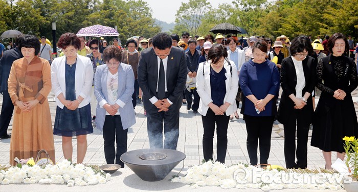 (김해=포커스뉴스) 23일 오후 경남 김해 봉하마을에서 엄수된 故 노무현 전 대통령 서거 7주기 추도식에 참석한 송영길(왼쪽 네번째) 더불어민주당 당선인 등 시민들이 분향을 하고 있다.