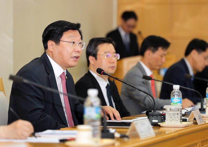 (울산=포커스뉴스) 주형환(왼쪽) 산업통상자원부 장관이 23일 오후 울산시 울산상공회의소 회의실에서 열린 울산지역 기업인과의 간담회에 참석해인사말을 하고 있다.