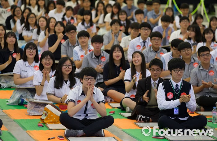 (세종=포커스뉴스) 23일 오후 세종시 정부세종컨벤션센터에서 민주평화통일자문회의 주최로 열린 2016 민주평통 통일골든벨 세종·충남대회에 참가한 학생들이 문제를 풀기 앞서 축하공연을 바라보고 있다.