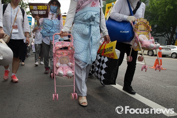 (서울=포커스뉴스) 23일 오후 서울 중구 시청광장 인근에서 보육관계자들이 '어린이집 0~2세 맞춤형보육 제도개선 및 시행 연기'를 촉구하며 가두행진을 하고 있다.