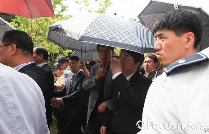 (김해=포커스뉴스) 23일 오후 경남 김해 봉하마을에서 엄수된 故 노무현 전 대통령 서거 7주기 추도식을 마친 뒤 안철수 국민의당 상임공동대표가 우산을 쓴 채 식장을 나서고 있다.
