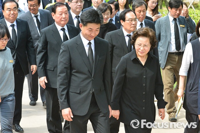 (김해=포커스뉴스) 23일 오후 경남 김해 봉하마을에서 엄수된 故 노무현 전 대통령 서거 7주기 추도식을 마친 뒤 노 전 대통령 부인 권양숙 여사와 장남 건호 씨 등 참석자들이 묘역 참배 및 헌화를 위해 이동하고 있다.