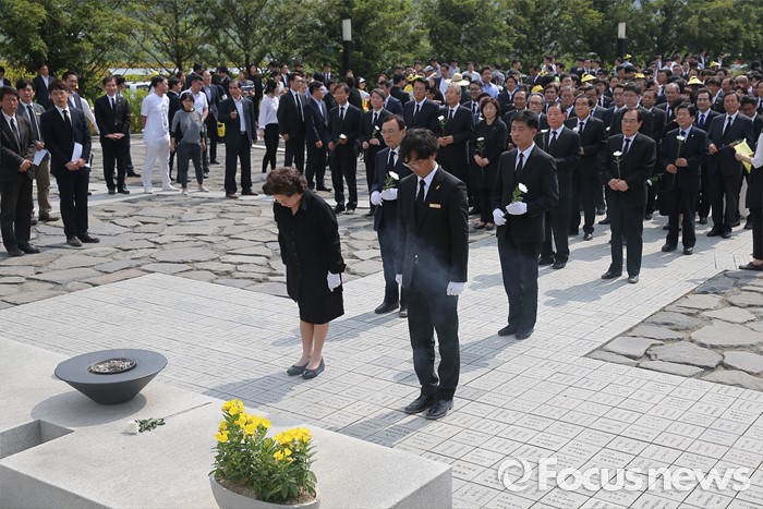 (김해=포커스뉴스) 23일 오후 경남 김해 봉하마을에서 엄수된 故 노무현 전 대통령 서거 7주기 추도식을 마친 뒤 노 전 대통령 부인 권양숙 여사와 장남 건호 씨 등 참석자들이 묘역 참배 및 헌화를 하고 있다.
