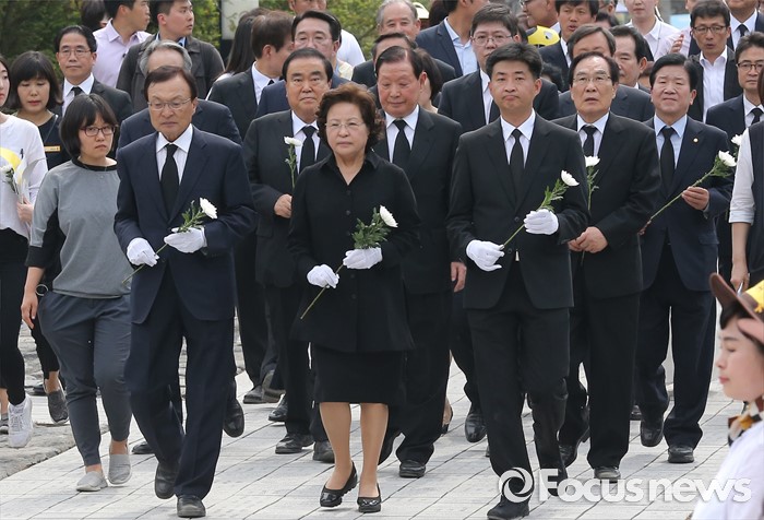 (김해=포커스뉴스) 23일 오후 경남 김해 봉하마을에서 엄수된 故 노무현 전 대통령 서거 7주기 추도식을 마친 뒤 노 전 대통령 부인 권양숙 여사와 장남 건호 씨 등 참석자들이 묘역 참배 및 헌화를 하고 있다.