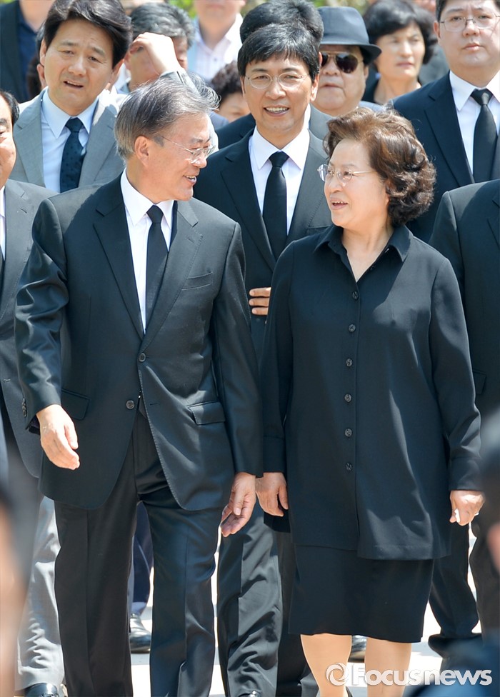 (김해=포커스뉴스) 23일 오후 경남 김해 봉하마을에서 엄수된 故 노무현 전 대통령 서거 7주기 추도식에 노 전 대통령의 부인 권양숙(오른쪽) 여사와 문재인 더불어민주당 전 대표가 참석하고 있다.