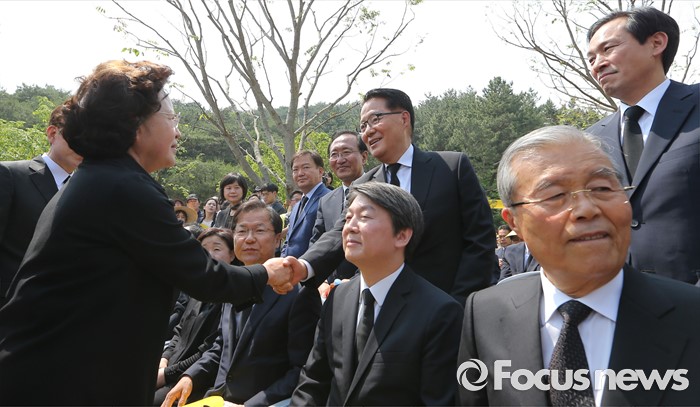 (김해=포커스뉴스) 23일 오후 경남 김해 봉하마을에서 엄수된 故 노무현 전 대통령 서거 7주기 추도식에 참석한 노 전 대통령 부인 권양숙(왼쪽 첫번째) 여사와 박지원(뒷줄 오른쪽 두번째) 국민의당 원내대표가 인사하고 있다.