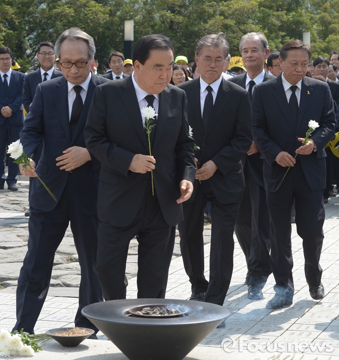 (김해=포커스뉴스) 23일 오후 경남 김해 봉하마을에서 엄수된 故 노무현 전 대통령 서거 7주기 추도식을 마친 뒤 이병완(왼쪽부터) 전 대통령 비서실장, 문희상 더불어민주당 의원, 문재인 전 대표, 고영구 전 국정원장 등이 묘역 참배 및 헌화를 하고 있다.