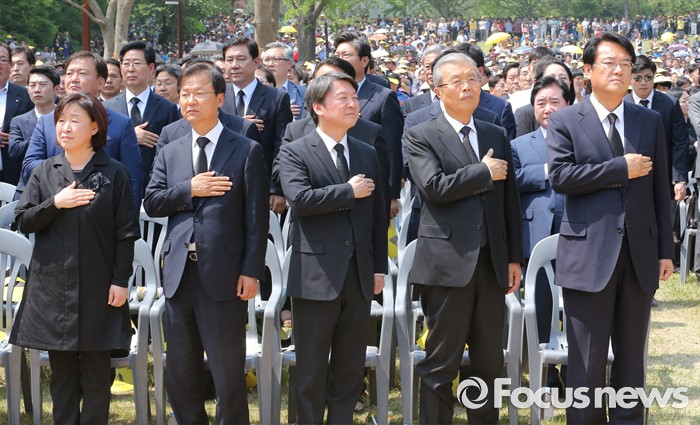 (김해=포커스뉴스) 23일 오후 경남 김해 봉하마을에서 엄수된 故 노무현 전 대통령 서거 7주기 추도식에 참석한 정진석(오른쪽부터) 새누리당 원내대표, 김종인 더불어민주당 비대위 대표, 안철수 국민의당 상임공동대표, 천정배 공동대표, 심상정 정의당 상임대표가 국기에 대한 경례를 하고 있다.
