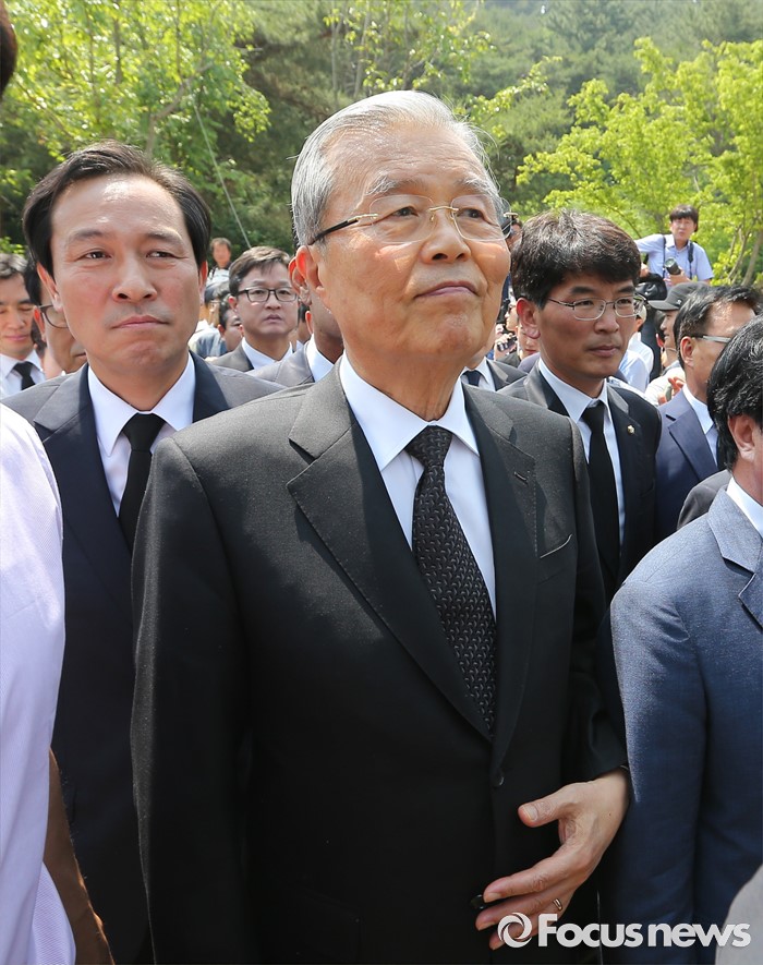 (김해=포커스뉴스) 23일 오후 경남 김해 봉하마을에서 엄수된 故 노무현 전 대통령 서거 7주기 추도식에 김종인(가운데) 더불어민주당 비대위 대표, 우상호(왼쪽) 원내대표 등이 참석하고 있다.