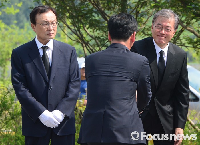 (김해=포커스뉴스) 23일 오후 경남 김해 봉하마을에서 엄수된 故 노무현 전 대통령 서거 7주기 추도식에 참석한 문재인 더불어민주당 전 대표가 헌화를 마치고 나서는 참배객과 인사하고 있다. 왼쪽은 이해찬 노무현재단 이사장.
