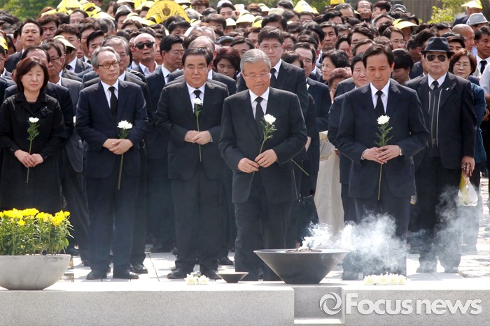 (김해=포커스뉴스) 23일 오후 경남 김해 봉하마을에서 엄수된 故 노무현 전 대통령 서거 7주기 추도식을 마친 뒤 김종인 더불어민주당 비대위 대표, 우상호 원내대표 등이 묘역 참배 및 헌화를 하고 있다.