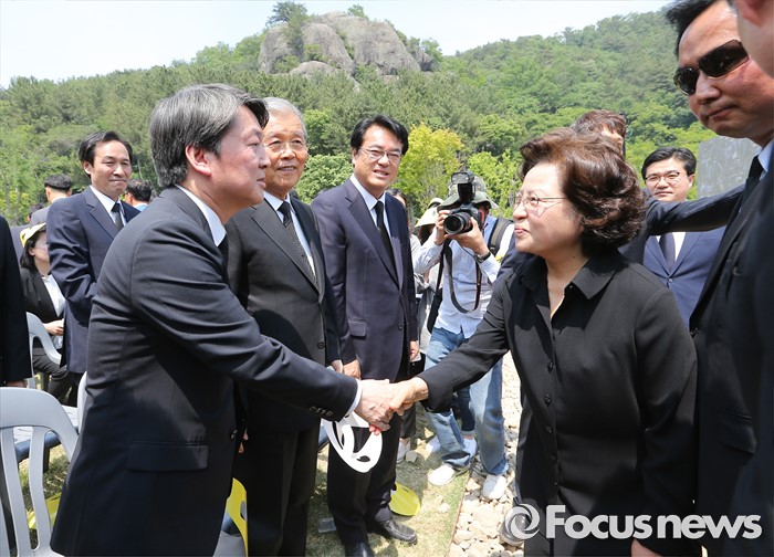 (김해=포커스뉴스) 23일 오후 경남 김해 봉하마을에서 엄수된 故 노무현 전 대통령 서거 7주기 추도식에 참석한 노 전 대통령 부인 권양숙(오른쪽 첫번째) 여사와 안철수(왼쪽 첫번째) 국민의당 상임공동대표가 인사하고 있다.
