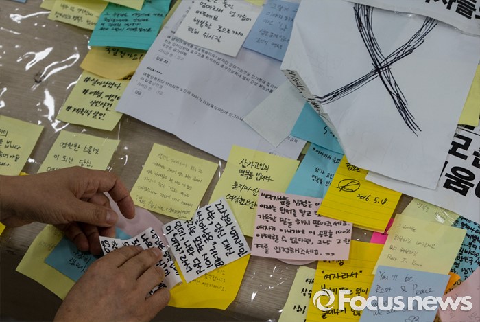 (서울=포커스뉴스) 23일 오후 서울 동작구 서울여성플라자 로비에 마련된 추모 전시장에서 여성가족재단 직원들이 강남역 묻지마 살인 피해자 추모 기록물들을 정리하고 있다.