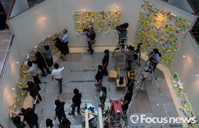 (서울=포커스뉴스) 23일 오후 서울 동작구 서울여성플라자 로비에 마련된 추모 전시장에서 여성가족재단 직원들이 강남역 묻지마 살인 피해자 추모 기록물들을 게시하고 있다.