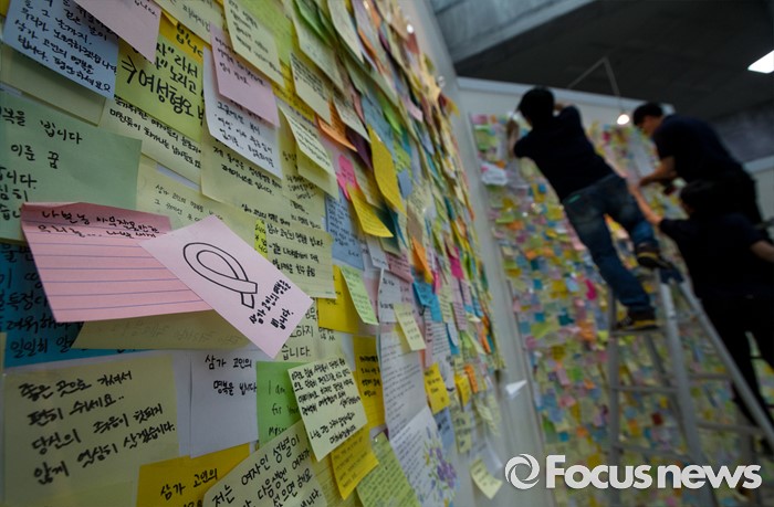 (서울=포커스뉴스) 23일 오후 서울 동작구 서울여성플라자 로비에 마련된 추모 전시장에서 여성가족재단 직원들이 강남역 묻지마 살인 피해자 추모 기록물들을 게시하고 있다.
