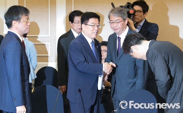 (서울=포커스뉴스) 24일 오전 서울 여의도 국회 귀빈식당에서 열린 조선·해운업 구조조정 관련 당정협의에 참석한 김광림 새누리당 정책위의장과 임종룡 금융위원장 등 참석자들이 인사하고 있다. 왼쪽부터 최상목 기획재정부 1차관, 김 정책위의장, 임 위원장, 이관섭 산업통상자원부 1차관.