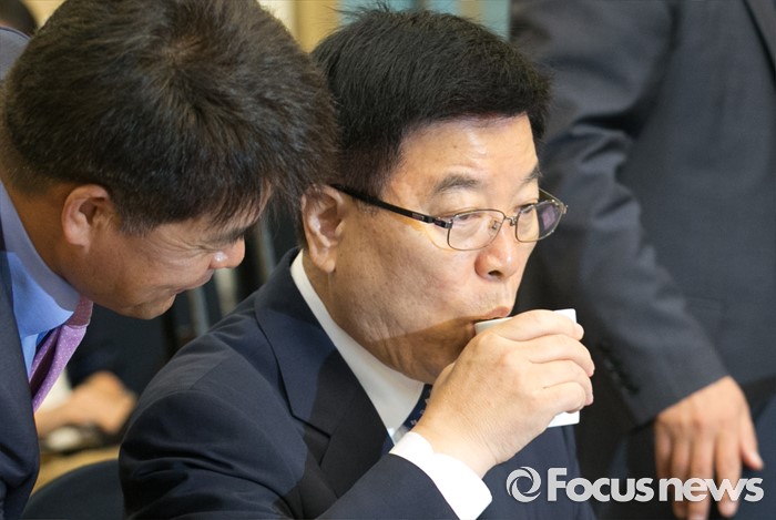 (서울=포커스뉴스) 24일 오전 서울 여의도 국회 귀빈식당에서 열린 조선·해운업 구조조정 관련 당정협의에 참석한 김광림 새누리당 정책위의장이 물을 마시고 있다.
