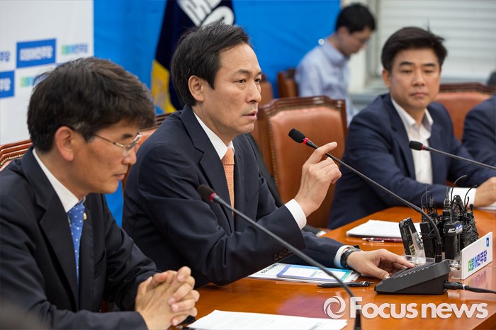 (서울=포커스뉴스) 우상호(왼쪽 두 번째) 더불어민주당 원내대표가 24일 오전 서울 여의도 국회의서 열린 원내대책회의에 참석해 모두발언 하고 있다.