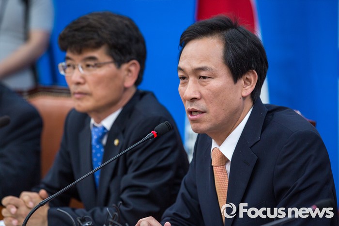 (서울=포커스뉴스) 우상호(오른쪽) 더불어민주당 원내대표가 24일 오전 서울 여의도 국회의서 열린 원내대책회의에 참석해 모두발언 하고 있다.