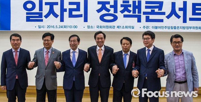 (서울=포커스뉴스) 우상호(가운데) 더불어민주당 원내대표와 박원순(왼쪽 세 번째) 서울시장을 비롯한 지자체장들이 24일 오전 서울 여의도 국회의원회관에서 열린 '지자체장 초청 일자리 정책 콘서트'에 참석해 손을 잡고 사진촬영을 하고 있다.