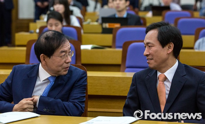 (서울=포커스뉴스) 우상호(오른쪽) 더불어민주당 원내대표와 박원순 서울시장이 24일 오전 서울 여의도 국회의원회관에서 열린 '지자체장 초청 일자리 정책 콘서트'에 참석해 대화를 나누고 있다.