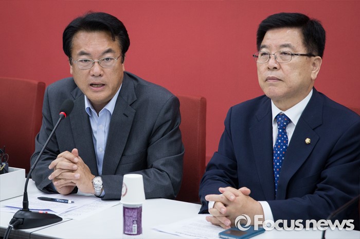 (서울=포커스뉴스) 정진석(왼쪽) 새누리당 원내대표 김광림 정책위의장이 24일 오전 서울 여의도 국회에서 가습기살균제 피해자와 가족 모임 면담을 하고 있다.
