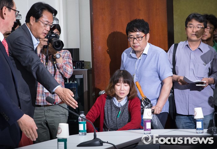 (서울=포커스뉴스) 정진석 새누리당 원내대표가 24일 오전 서울 여의도 국회에서 열린 가습기살균제 피해자와 가족 모임 면담에서 피해자들을 맞이하고 있다.