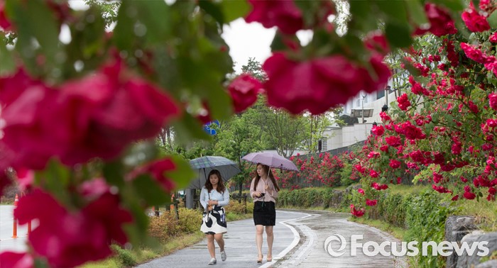 (세종=포커스뉴스) 전국적으로 비가 내린 24일 오후 세종시 정부세종청사 국무총리실 울타리에 핀 장미 사이로 청사 직원들이 우산을 쓰고 지나고 있다.