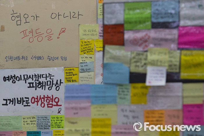 (서울=포커스뉴스) 24일 오전 강남역 인근 주점 화장실 살인사건 피해자 추모 공간이 옮겨진 서울시청 시민청에 추모 쪽지가 전시되어 있다.
