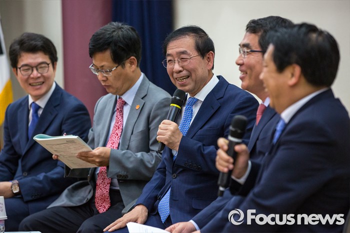 (서울=포커스뉴스) 박원순(왼쪽 세 번째) 서울시장이 24일 오전 서울 여의도 국회의원회관에서 열린 '더불어민주당, 지자체장 초청 일자리 정책 콘서트'에 참석해 서울시 일자리 정책에 관해 설명 하고 있다.