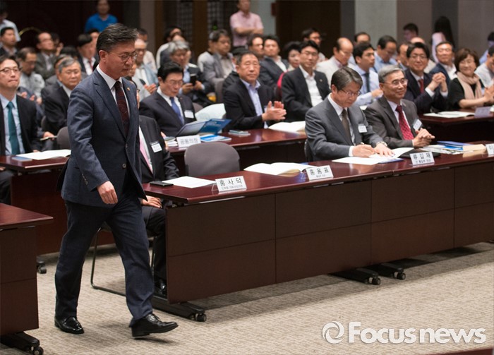 (서울=포커스뉴스) 천안함 피격사건을 계기로 5·24 대북제재 조치가 취해진 지 6년이 되는 날인 24일 오후 서울 중구 프레스센터에서 열린 '통일공감포럼 발족식 및 통일공감대화'에 참석한 홍용표 통일부 장관이 축사를 하기 위해 자리를 나서고 있다.