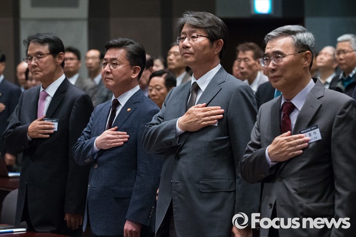 (서울=포커스뉴스) 천안함 피격사건을 계기로 5·24 대북제재 조치가 취해진 지 6년이 되는 날인 24일 오후 서울 중구 프레스센터에서 열린 '통일공감포럼 발족식 및 통일공감대화'에 참석한 홍용표(왼쪽 두번째) 통일부 장관을 비롯한 내빈들이 국민의례를 하고 있다. 왼쪽부터 홍사덕 민화협 대표상임의장, 홍용표 장관, 류길재, 이종석 전 장관.