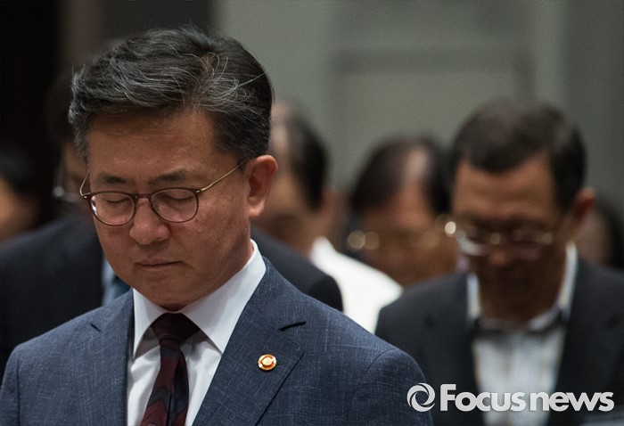 (서울=포커스뉴스) 천안함 피격사건을 계기로 5·24 대북제재 조치가 취해진 지 6년이 되는 날인 24일 오후 서울 중구 프레스센터에서 열린 '통일공감포럼 발족식 및 통일공감대화'에 참석한 홍용표 통일부 장관이 묵념하고 있다.